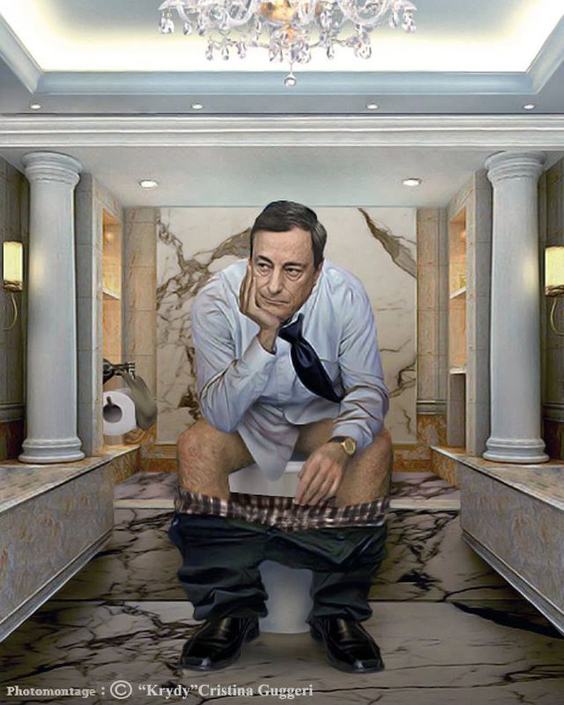 Los retratos de los líderes mundiales de la política y la religión sentados en la taza del baño