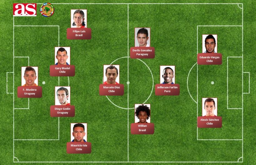 El diario español As incluyó a dos defensas de la Roja, a un volante y a dos delanteros. Dos uruguayos, dos uruguayos, un brasileño y un peruano cierran el equipo. Otros referentes del fútbol mundial también alabaron a Chile.